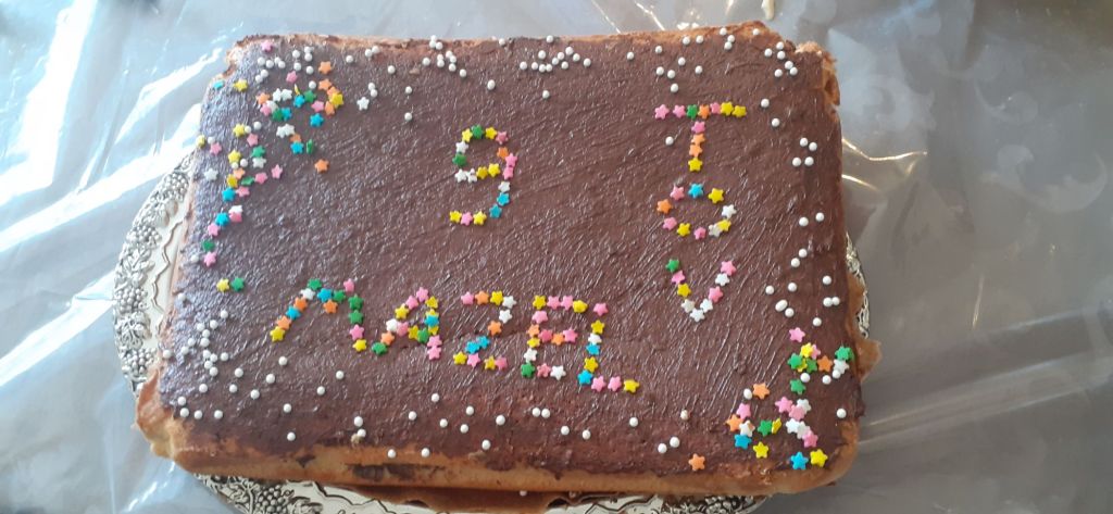 Расположились мы во дворе. Поставили там стол и скамейки. Дети, мальчики 8-9 лет, играли в прятки, в футбол, в другие игры. Не знаю русских названий уже. Заворачиваешь приз во много слоёв бумаги, эту «посылку» передают по кругу под музыку, когда музыка останавливается, ты можешь разорвать один слой бумаги. Приз достаётся тому, кто разорвал последний слой. Внутри была шоколадка, и её поделили на всех. А ещё была «бомба». Такая коробка-питарда. Её фитиль поджигают, и из неё высыпаются всякие тематические безделушки.