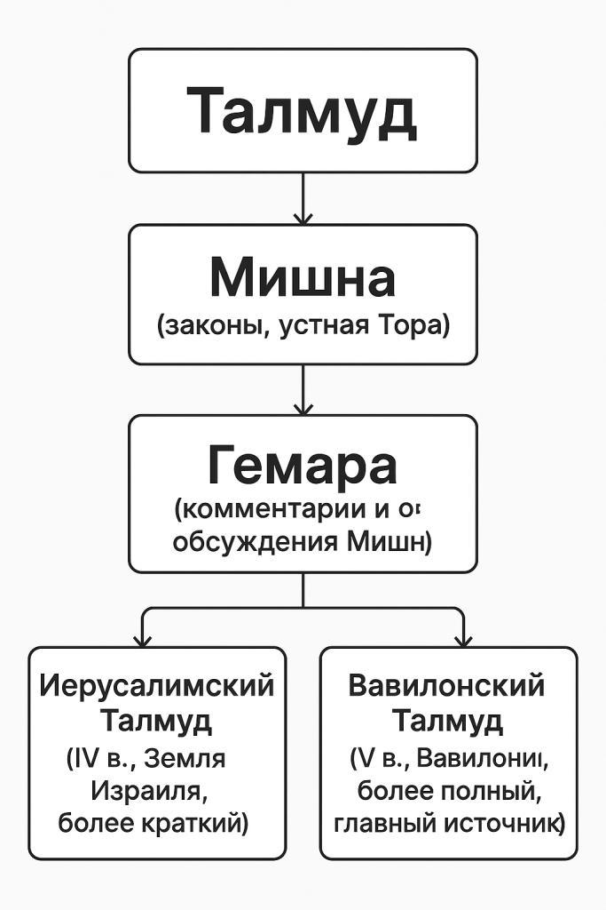 - Гемара – комментарии и обсуждения Мишны (раввинские споры, толкования, примеры).